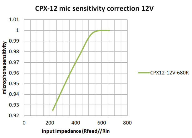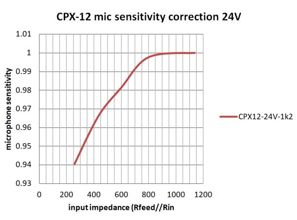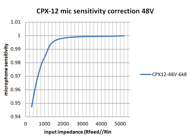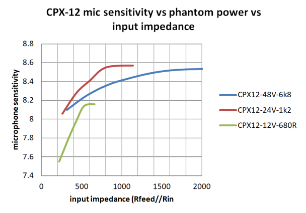 The following diagramms give you an idea what you can expect in mic sensitivity for standard phantom power voltages using the associated feeding resistors. The input impedance is meant to the feeding resistor parallel to the input resistor.